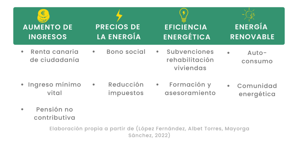 A continuación describimos brevemente algunas medidas para abordar la pobreza energética a nivel local en La Palma, podemos agrupar estas medidas en 4 grandes grupos: