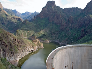 En Gran Canaria tenemos el conocido Salto de Chira – Soria, central hidroeléctrica reversible o bombeo, que se fundamenta en aprovechar el desnivel existente entre el embalse superior (Chira) y el inferior (Soria), con el objetivo de almacenar energía renovable en forma de agua.