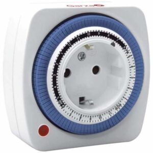 En este modelo de enchufe vemos las marcas negras que indican las divisiones horarias y en un aro externo una serie de franjas azules que podemos presionar a voluntad. Cada una de estos segmentos representan 15 minutos, de forma que funciona como un temporizador mecánico que intercede en el flujo de la electricidad. Por ejemplo, presionando todas las piezas que van desde las 23:00 hasta las 11:00 horas, bloquearemos el paso de la electricidad para esta franja horaria, por lo que tendremos el enchufe funcionando desde las 11 de la mañana hasta las 23 de la noche. El piloto rojo nos muestra en qué momentos está en funcionamiento y cuando no. Este horario nos sirve para que el termo eléctrico solo caliente agua desde el mediodía hasta la noche, en lugar de mantener el agua caliente durante todo el día. Tendremos un gasto de electricidad correspondiente a 12 horas en lugar de 24 horas, con el correspondiente ahorro que eso supone. Fuente: garza.es