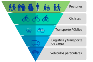 Pirámide de la movilidad urbana, con el objetivo de reordenar las prioridades y recursos en el transporte en espacios públicos. Fuente: neten.es