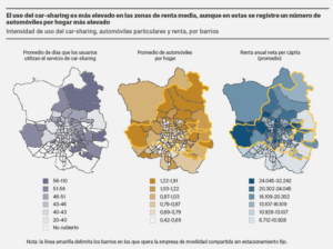 Además, los clientes que utilizaban el servicio de carsharing más a menudo residían en barrios de renta media, que, según se ha mencionado, se caracterizan por unas tasas de motorización elevadas y menos opciones de transporte público. En efecto, a la hora de predecir la probabilidad de efectuar un desplazamiento en carsharing sin estacionamiento fijo, la fidelización –o utilización del servicio reiteradas veces a lo largo del tiempo– fue un factor mucho más relevante que la renta, lo que sugiere que quizá no exista una estrecha relación entre la frecuencia de uso del carsharing y la renta, y que otros factores, en particular la falta de alternativas de movilidad, desempeñen un papel mucho más decisivo. Se ha constatado que muchos de lxs usuarixs más habituales del carsharing utilizan este servicio como sustituto del automóvil particular para complementar la red de transporte público existente.