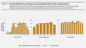 El uso del carsharing en la capital alcanza su nivel más elevado antes que el tráfico general y disminuye de forma significativa durante la hora punta del tráfico de la mañana. Además, es una opción muy popular en verano, cuando el tráfico convencional disminuye. Ello sugiere que este tipo de movilidad compartida contribuye a atenuar el tráfico rodado y, por consiguiente, a reducir la congestión del tránsito urbano.