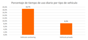 Tiempo medio de uso por vehículo y día (%). El tiempo medio de uso vehículo/día de carsharing es del 18,7%, lo que supone una liberación análoga de espacio de aparcamiento principalmente en las horas de mayor demanda. Un vehículo de carsharing se utiliza más del doble que un vehículo en propiedad, el cual pasa de media el 90% de tiempo al día estacionado.
