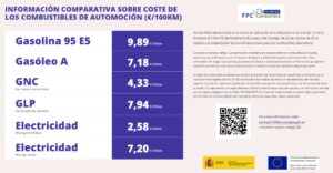 Información comparativa sobre el coste de los combustibles de automoción en €/100km. Fuente: eurospor100km.energia.gob.es