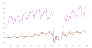 Pasajeros en los aeropuertos de Canarias por año (2014-2025). En morado provenientes del extranjero, en rojo España (excluida Canarias), en azul oscuro Canarias. Para consultar datos actualizados, clicar aquí. Fuente: AENA