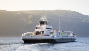Catamarán eléctrico ‘MV Ampere’, primer ferry a batería del mundo. Puesto en servicio en Noruega en el año 2015. Tiene una capacidad para llevar hasta 120 coches y 12 camiones disponiendo de una batería de 1 MW. Fuente: kanebridgenews.com